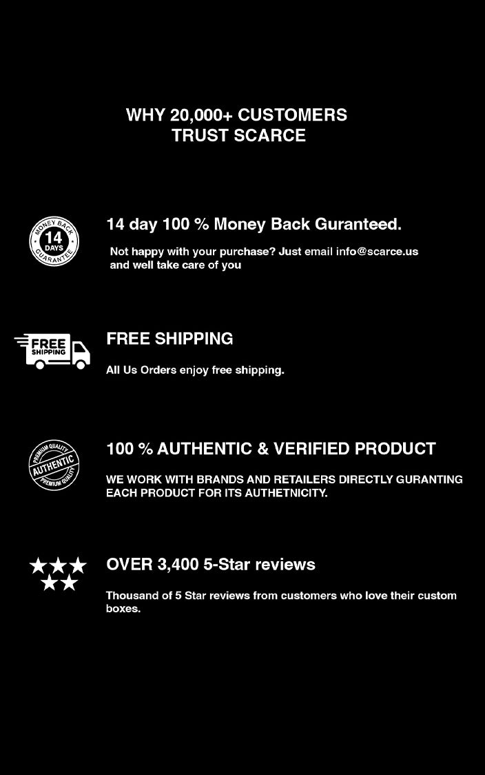 Every Scarce Box is hand-picked from our inventory of brand new and guaranteed authentic merchandise. Please allow 3 to 7 days for us to process your order, at which point a tracking number will be emailed to you. Shop with confidence: Scarce offers a 14-day return policy to ensure your 100% satisfaction.